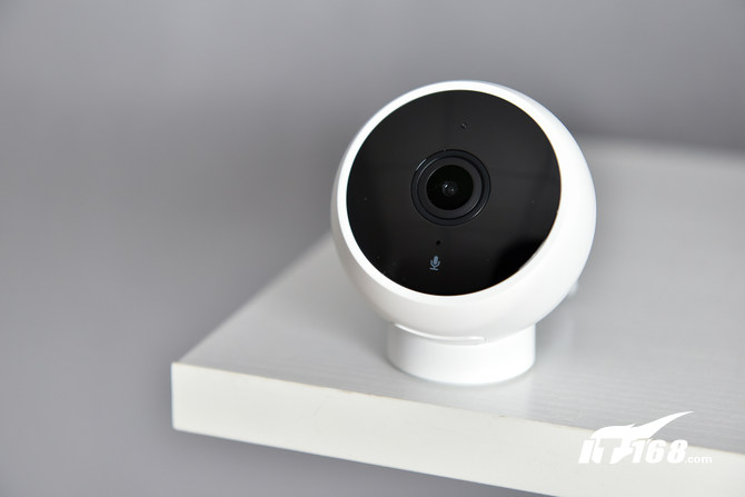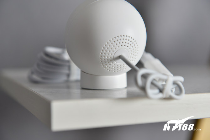 摄像机表面有透明塑料膜作为保护,撕掉后能看到采用了黑色亮面设计,摄像头上方是指示灯,下方设有麦克风开孔,它支持全双工语音通话,简单来说,外出时使用手机不仅能查看家里的画面,还可借由这台摄像机与家人双向语音交流。