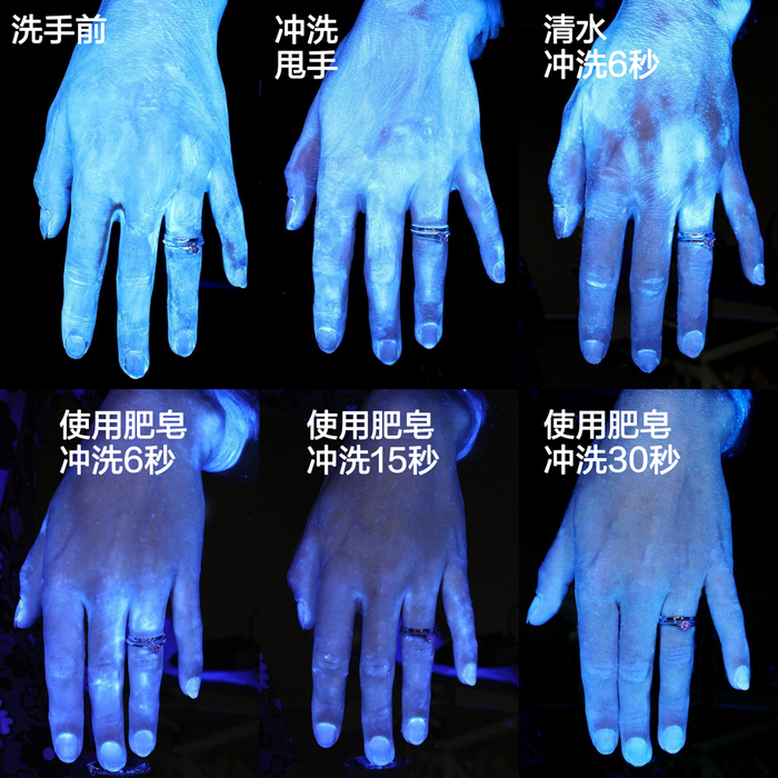 早在2015年,英国每日邮报的编辑JennieAgg为了凸显洗手前后的差别,实验前特地使用了一种叫做GloGerm(一种矿物油,5微米大小的颗粒可以与细菌结合)的特殊凝胶,来加强细菌在紫外线光下的样子,如果越白越亮,就表示细菌越多!