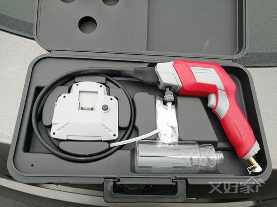 空压机和可视清洗枪是清洗中央空调室内机的利器。可视清洗枪前段是一个细长的管路,它可以穿过出风口的缝隙到达室内机的任何一个角落,将清洁剂喷洒在需要清洗的位置。清洗枪上的显示屏可以让操作人员清楚的看到室内机内部的情况,随时查看各个部位是否清洗到或清洗的是否干净,如果没有达到预计的效果,可以再一次的进行局部清洗。清洗枪前段透明的容器瓶用于盛放清洁剂。空压机的作用是负责给清洗枪加压,清洁剂喷洒的更有力、更细化,将清洁剂喷洒到室内机最深处的角落。