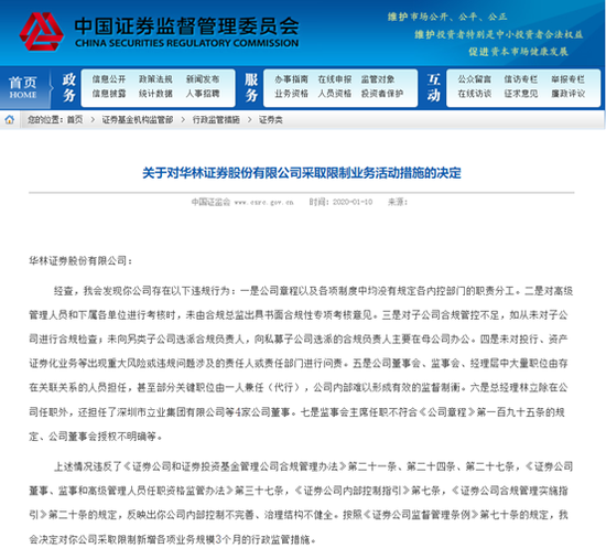 同日证监会公布的另一份文件显示,按照《证券公司监督管理条例》第七十条的规定,证监会决定对华林证券采取限制新增各项业务规模3个月的行政监管措施。