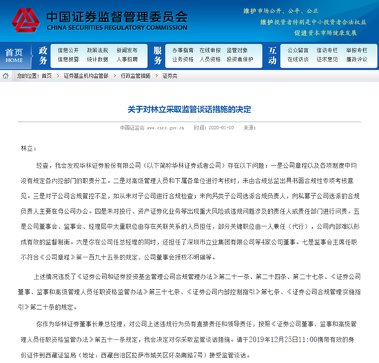 证监会网站1月10日发布公告,因华林证券存在七方面违规行为,对公司董事长林立采取监管谈话措施。