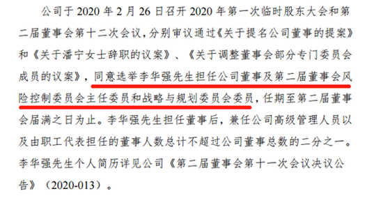 同时公布的还有李华强的任职,李华强1月份入选公司董事,进入风控、战略委员会,且担任风控委员会主任委员。