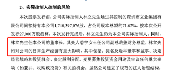 引人注目的,还有潘宁作为董事长、总经理林立的夫人身份,公司在2018年上市招股书中也提到,林立夫妇对公司的日常生产经营有重大影响。