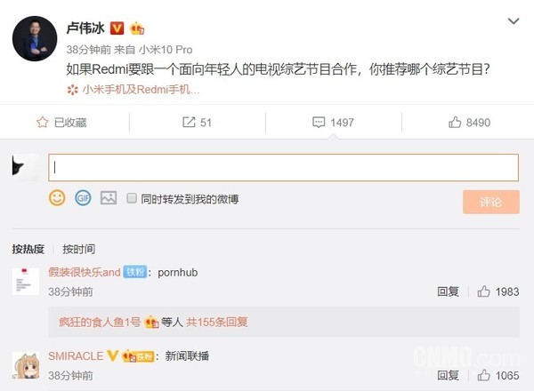 卢伟冰在微博上连发了两条“调查问卷”式的微博,一条是:Redmi K30 Pro计划跟今年一部未上映的电影合作,大家推荐哪部?另一条则是:如果Redmi要跟一个面向年轻人的电视综艺节目合作,你推荐哪个综艺节目?这种开放式的问题自然能引发网友心中的热情。